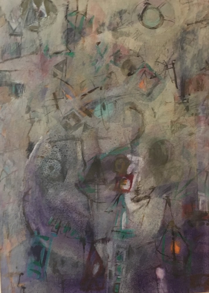 Lee Deffebach spent 1945 – 1949 in New York City, where she first sold pictures and mirrors at Macy’s during the day, and took night art classes at the Art Students League. Absorbing the mature Abstract Expressionist ethos of the time, she created this powerful picture consisting of fractured geometric planes and elements that only suggest realistic objects. The different shades of blue foreshadow the deft and frequent use of this color throughout her career.