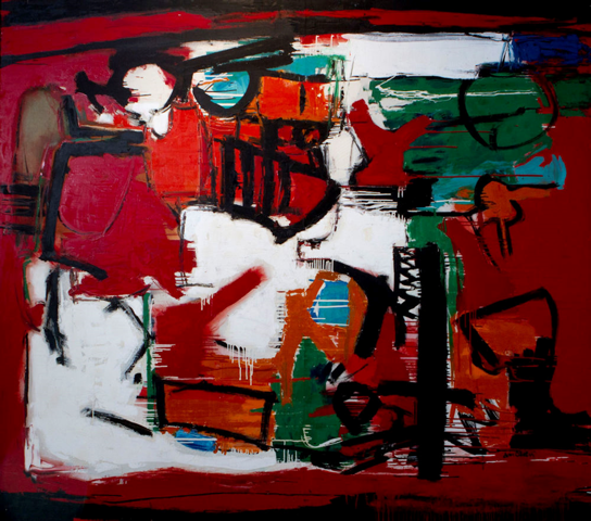 Olsen wisely balances the red in this composition with four swaths of white that serve to not only confine and control the red but also provide the work with balance. He varies the directions of his black strokes, working in a square-like pattern to set a structure and give his shapes a foundation to work. In this way, the work can be read from the corner down around to the top again in a flowing motion that is balanced yet wild, strong yet fluid, aggressive yet organized.