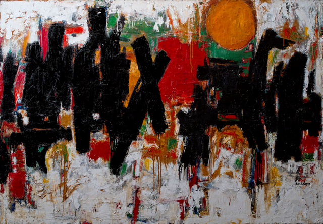 Movement is an appropriate descriptor for this composition as small black strokes are answered by large ones that seem to march across the canvas. Olsen uses white on the borders of the work and concentrates the color and motion in the center of the work, focusing our eye and our attention. The orange of the circle on the bottom of the work is a natural continuation of the red beneath the black, that serves to keep the black from overtaking the work running off Olsen’s easel.