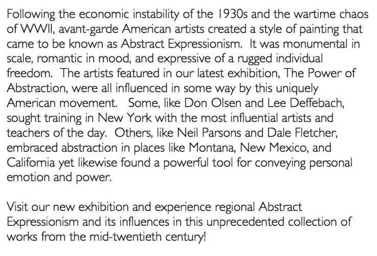 “The decade when modern artists were struggling for recognition was also notable, both in Utah and in the nation, for its turbulence and violent extremes of style, bitter arguments, and in incessant experimentation…Thanks to the articles of critics Harold Rosenberg and Clement Greenberg, Utah artists were exposed to the language of abstract expressionism. Radical changes in style, technique, and intent resulted in paintings on a new, larger scale that effaced the remaining differences between line and paint and affirmed two-dimensionality.”