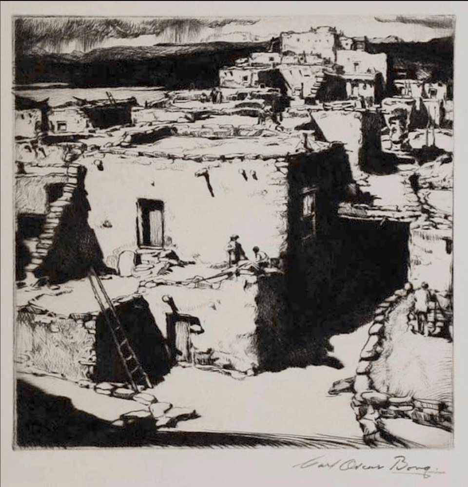 It was, and remains, extremely rare for Anglos to be invited to reside with and observe the Hopi. Dixon spent considerable time in Hopi country, including a 1923 trip in which he convalesced for four months, living with Namoki, one of the snake priests, and his blind brother, Loma Himma. Dixon earned the trust of his Native American acquaintances and subjects through the years through showing them respect and displaying a genuine interest in their beliefs, practices, and cultures. Even though he worked an an illustrator of western subjects, he had disdain for romanticized, condescending depictions of all westerners. Here he has created an honest and admiring imaged of the Hopi village adobe architecture and ceremonial structure of the kiva.