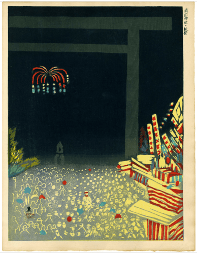 "Yasukuni Jinja no Aki Matsuri" (The Autumn Festival at Yasukuni Shrine). Thousands of people are watching the fireworks. The large torii gate looms over them. Yasukuni shrine is a large Shinto shrine which commemorates fallen soldiers. The series One Hundred Pictures of Great Tokyo in the Showa Era was created between 1928 and 1940 and depicted the new land marks, and the people of Tokyo's daily lives during the recovery from the Great Kanto Earthquake of 1923.
