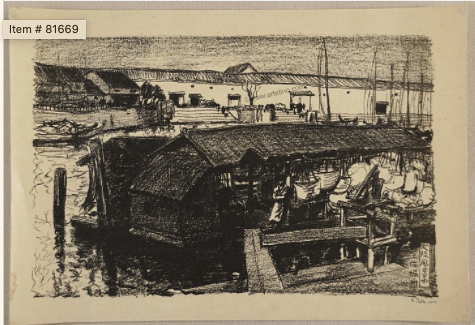 From the series, "Osaka fukei" (Views of Osaka). "Tosabori River" A house boat anchored in the Tosabori river. A row of storage houses are lining up on the opposite river bank. Kazuma Oda was a well know Sosaku Hana artist. Very Rare. Before W.W.II.