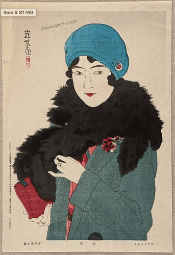 "Senshun" (Early Spring). Modern fashionable lady wearing a fur and a blue cap. A rare newspaper insert, "Showa Bijin Fuzoku", for Jiji Shinpo Newspaper.
