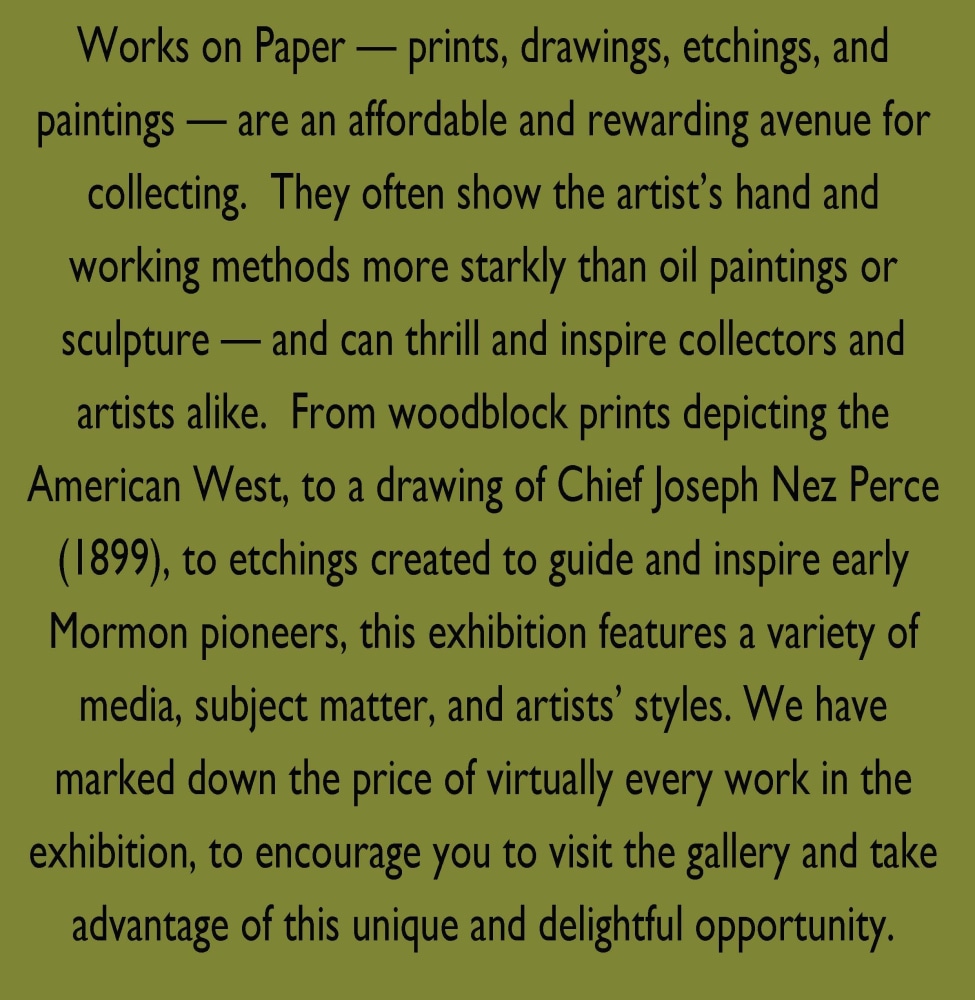 Harwood produced several paintings and etchings of the former farm and mill of Mormon colonizer Brigham Young, which later became Liberty Park in Salt Lake City. This lovely, gem-like etching recalls the French Barbizon School training that Harwood received in Paris, and which he successfully translated into a celebration of rural life in Utah. A late afternoon sun lights the cultivated fields, and on the mill's western adobe wall, as the days sets on land that is now part of an urban oasis.